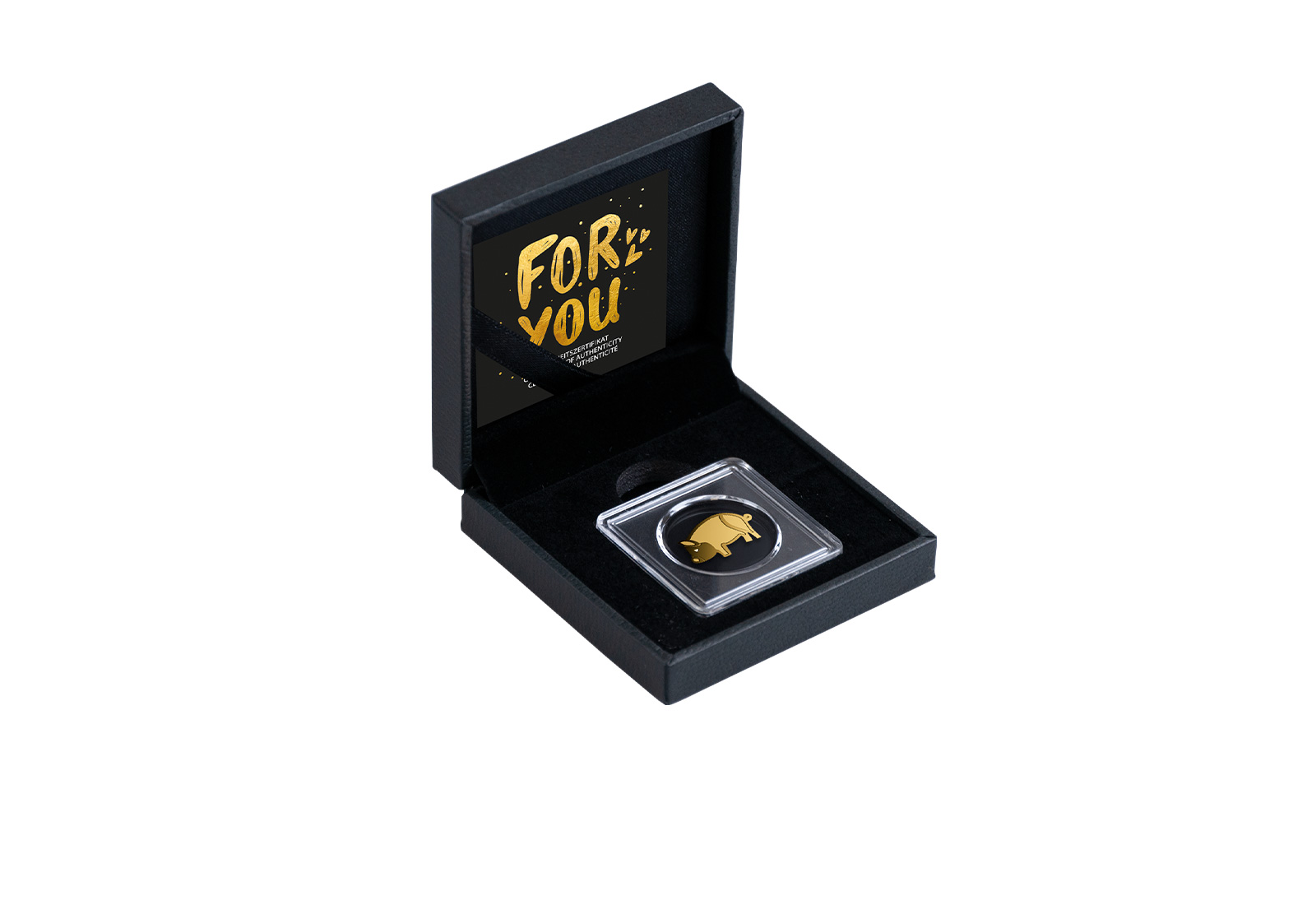 Die Goldausgabe stellt eine Darstellung des Glücksschwein dar. Gefertigt aus Gold mit der Feinheit 999/1000, bringt diese Ausgabe den kulturellen Hintergrund des Glücksschweins auf stilvolle Weise zum Ausdruck und eignet sich als klassisches Zeichen guter Wünsche.