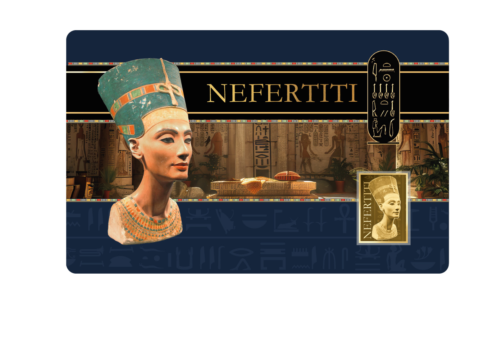 Die rechteckige Goldausgabe ist in die Goldcard integriert und zeigt auf der Vorderseite das Porträt der Nofretete mit der Aufschrift "NEFERTITI". Mit ihren kompakten Maßen ist sie ein eleganter Blickfang und ein attraktives Sammelobjekt mit kulturellem Bezug.