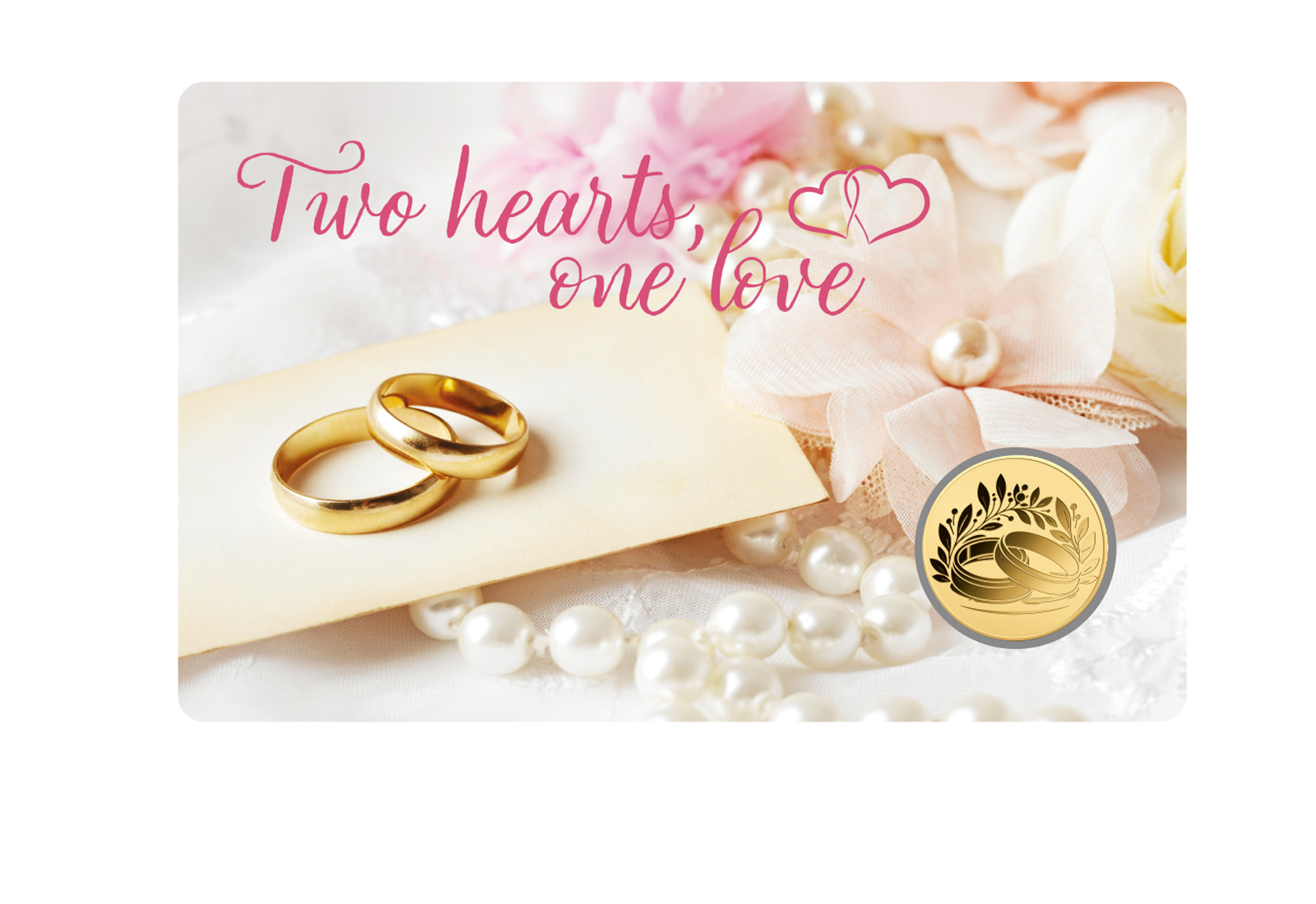 Auf der Vorderseite der Goldausgabe sind zwei Trauringe dargestellt, eingerahmt von einem dezenten floralen Kranz. Das Motiv wird durch die Inschrift "Two hearts, one love" ergänzt, die den Gedanken von Zusammengehörigkeit klar und international verständlich formuliert. Die Ausgabe besteht aus Gold mit einer Feinheit von 999/1000 und ist in eine Goldcard integriert die das Motiv aufgreift und eine stilvolle Präsentation darstellt.