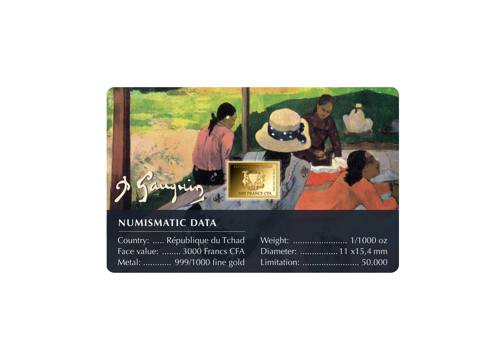 Diese stilvoll gestaltete Coincard zeigt das Motiv "Die Mittagsruhe" von Paul Gauguin und verbindet kunstgeschichtlich inspiriertes Design mit einer integrierten Goldmünze in 999/1000 Gold. Die Vorderseite der Coincard zeigt eine Szene mit mehreren Personen in entspannter Körperhaltung unter freiem Himmel - ein Moment des Innehaltens, eingefangen in charakteristischer Farbgebung und flächiger Komposition.