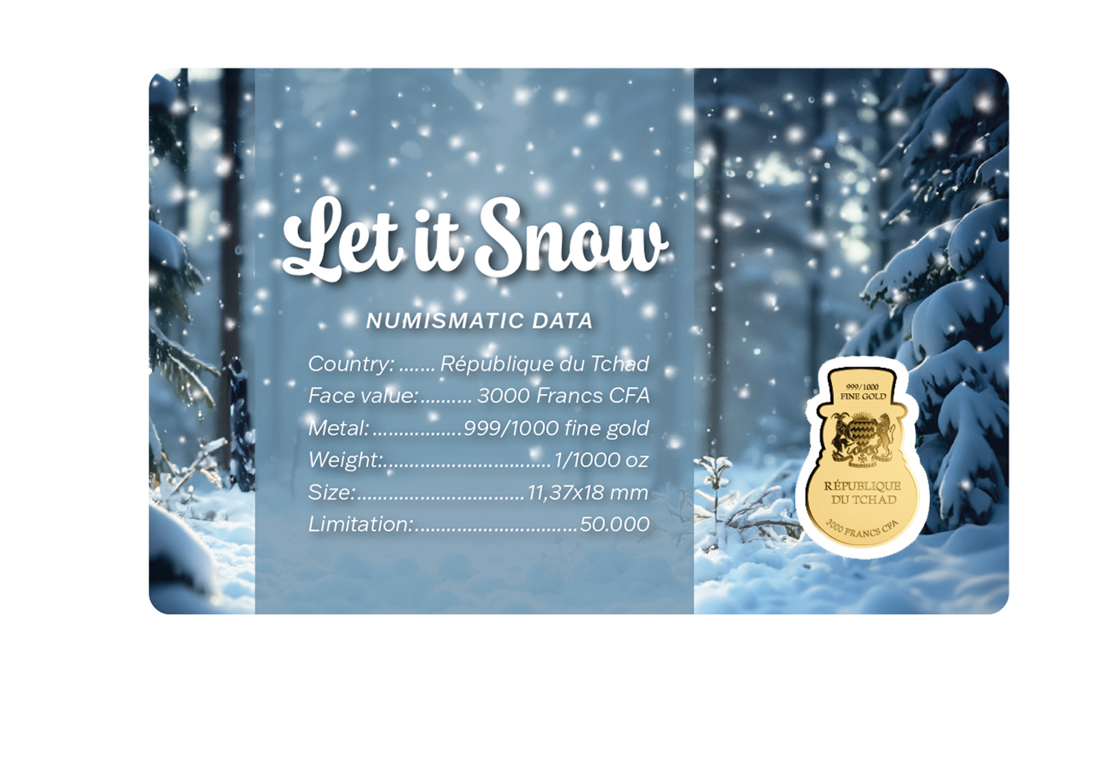 Auf der Vorderseite der Coincard sind zwei freundlich lächelnde Schneemänner in einem verschneiten Wald abgebildet. Sie tragen farbige Schals und Mützen und verbreiten eine herzliche, winterliche Atmosphäre. Der Slogan "Let it Snow" fügt sich harmonisch in das Motiv ein und rundet das winterliche Design stilvoll ab. Die Goldmünze ist auf der Vorderseite der Coincard integriert und zeigt die abstrahierte Silhouette eines Schneemanns mit Zylinder, Knöpfen und einem freundlichen Gesichtsausdruck.