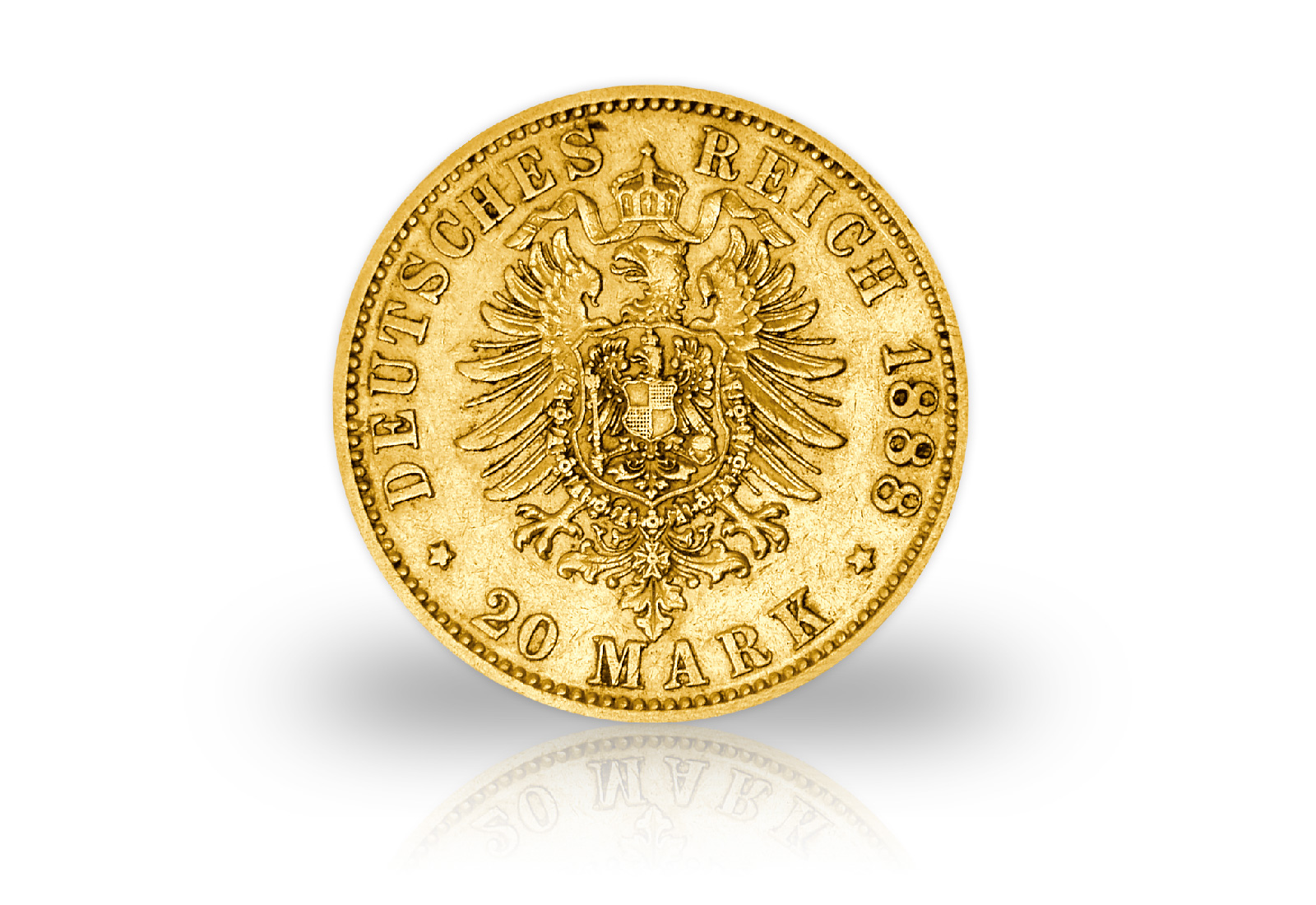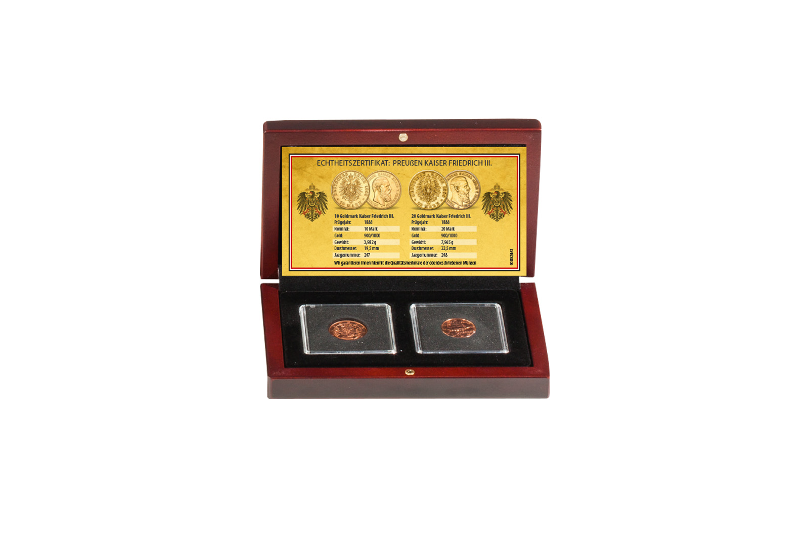 Wilhelm I. ebnete den Weg für das Deutsche Kaiserreich und festigte seine Macht, sein todkranker Sohn Friedrich III. bestieg danach den Thron und starb 99 Tage später, er unterlag dem Schicksal. Friedrich III. (*1831 bis 1888), Deutscher Kaiser vom 9. März 1888 bis zum 15. Juni 1888. Im Set Kaiserreich Preußen: 10 Mark, 900er Gold, 3,982 g, ø 19,5 mm; 20 Mark, 900er Gold, 7,965 g, ø 22,5 mm.