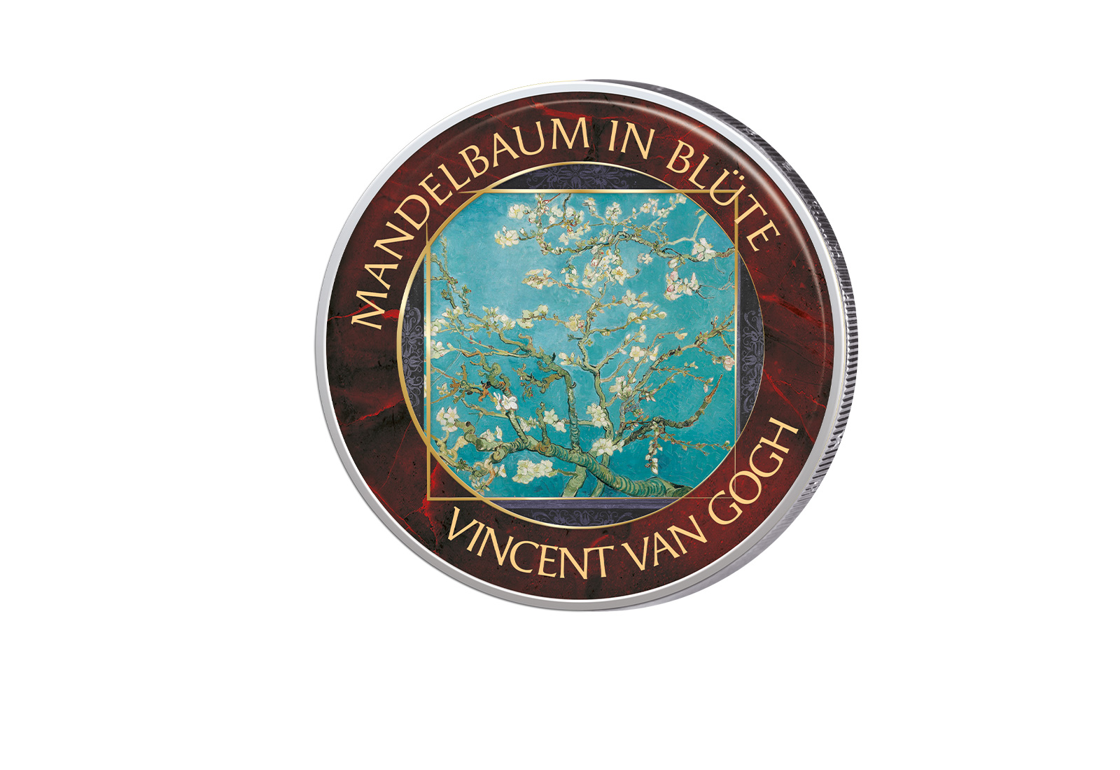 Auf der Motivseite der Münze ist im Zentrum das Kunstwerk "Mandelbaum in Blüte" von Vincent Van Gogh zu sehen. Dieses Werk ist bekannt für seine ungewöhnliche Farbgebung und eine charakteristische Kombination verschiedener Einflüsse, darunter die japanische Kunst, die einen starken Einfluss auf das Spätwerk des Künstlers hatte. Der breite Rand der Münze ist dunkel-rot eingefärbt. Am linken oberen Rand der Motivseite ist der Name des Gemäldes "Mandelbaum in Blüte" abgebildet und diagonal gegenüber am rechten unteren Rand steht der Name des Künstlers "Vincent Van Gogh".