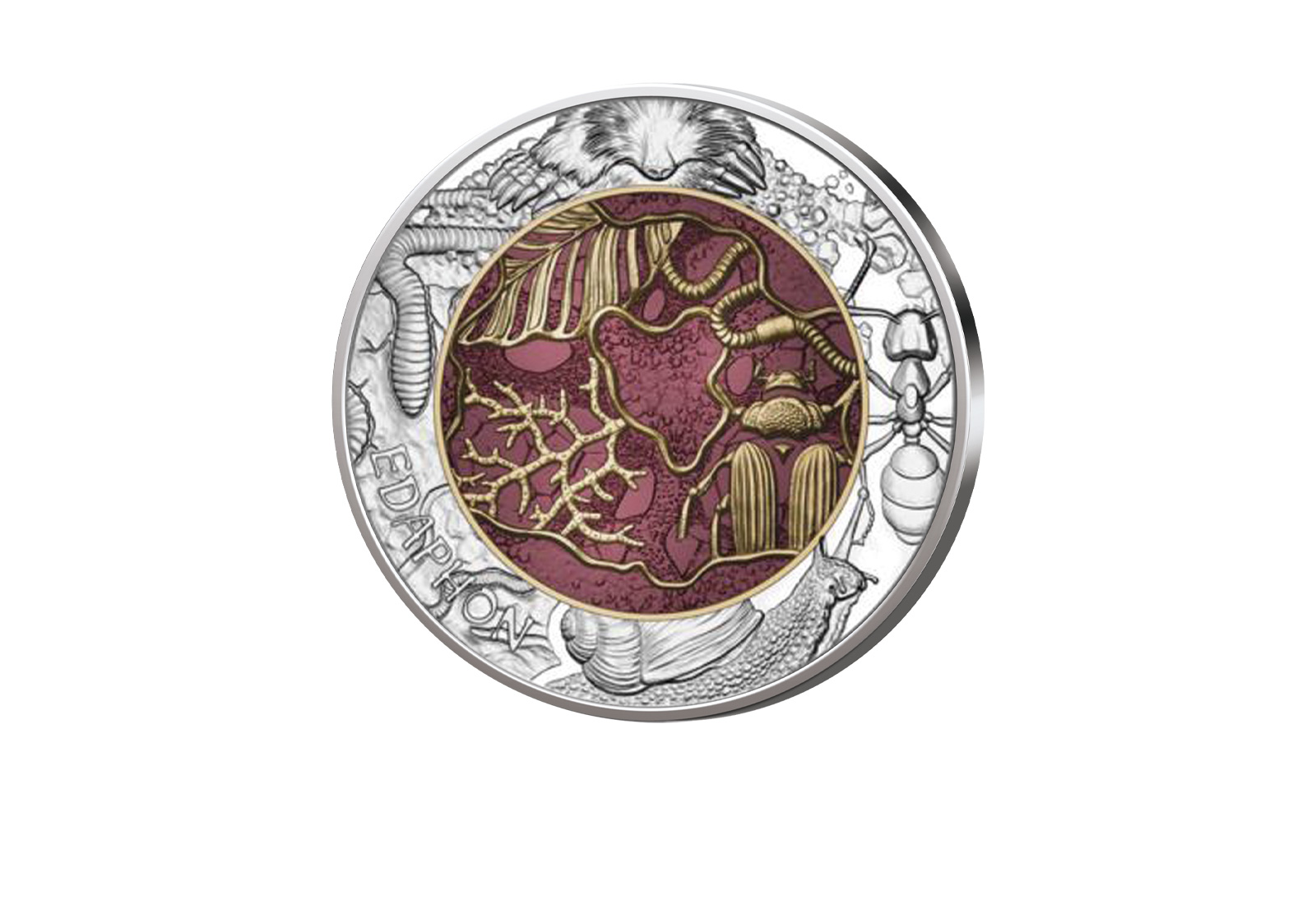 Die Münze besteht aus einem 8-Gramm-Niobkern und 8,5 Gramm Silber im Außenring, mit einem Gesamtgewicht von 16,5 Gramm und einem Durchmesser von 34 mm. Das Design vereint die künstlerische Darstellung der Bodenlebewesen mit den fünf Faktoren, die den Boden ausmachen: Zeit, mineralisches Material, Klima, Bodenorganismen und das Relief der Landschaft. In einem harmonischen Zusammenspiel von Farben und Formen wird die Botschaft von der Wichtigkeit des Bodens und seiner Bewohner vermittelt.