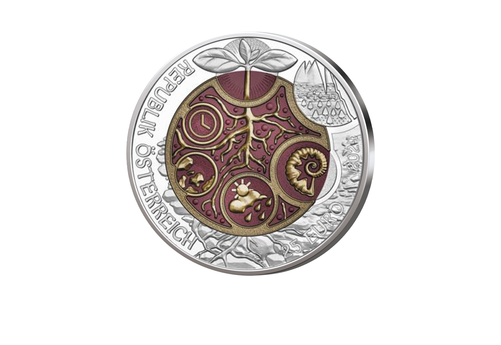 Die Österreich 25 Euro 2024 Münze aus der beliebten Silber-Niob-Serie zelebriert das Edaphon, die lebenswichtige Gemeinschaft aus Mikroorganismen, Würmern, Insekten und mehr, die im Boden lebt. Dieses vielfältige Ökosystem, das für Wachstum sorgt und neues Leben entstehen lässt, spielt eine entscheidende Rolle für die Fruchtbarkeit unseres Planeten und damit auch für die menschliche Existenz. Die Münze "Edaphon - Lebendiger Boden" hebt die Bedeutung dieses unsichtbaren Lebens hervor und mahnt zur Achtsamkeit im Umgang mit unserer Erde.