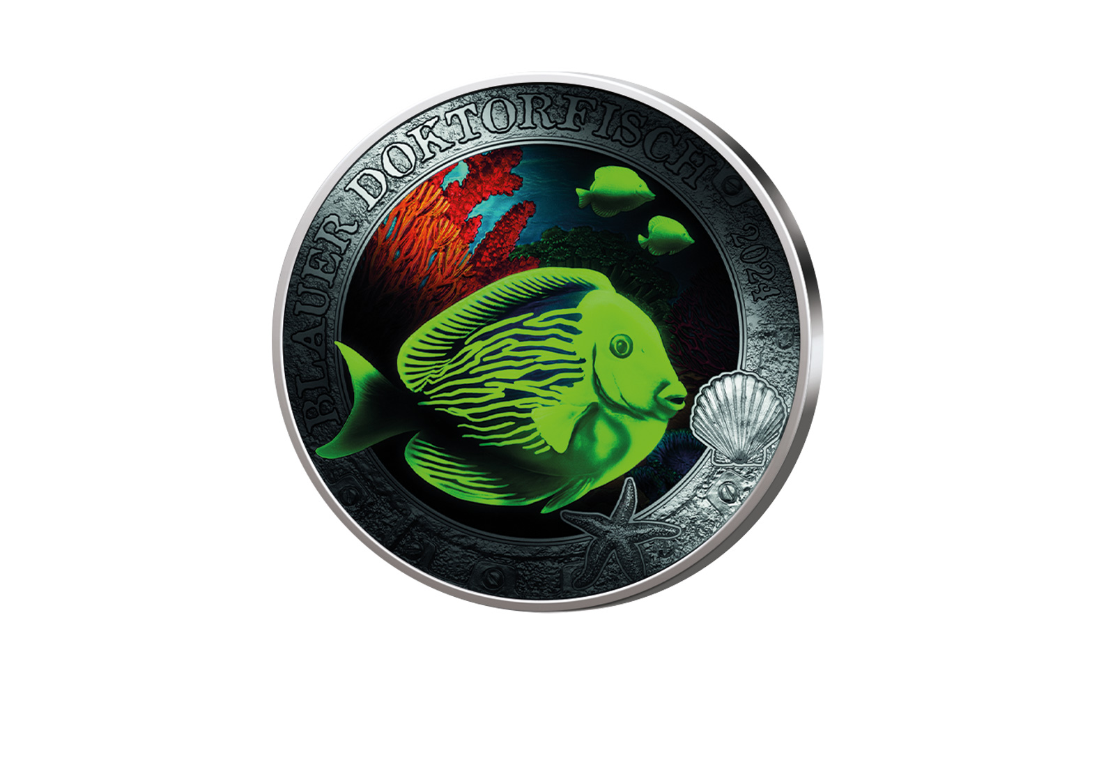 Die Münze zeigt den Blauen Doktorfisch, eingefasst in ein Bullauge mit dekorativen Elementen wie Muscheln und Seesternen. Sie besteht aus einer Kupfer-Nickel-Legierung, wiegt 16 Gramm und hat einen Durchmesser von 34mm. Ihre Prägequalität ist handgehoben und sie kommt in einer Münzkapsel, was sie besonders macht. Der spezielle UV-Farbdruck auf der Münze ermöglicht es, dass sie unter UV-Licht leuchtet.