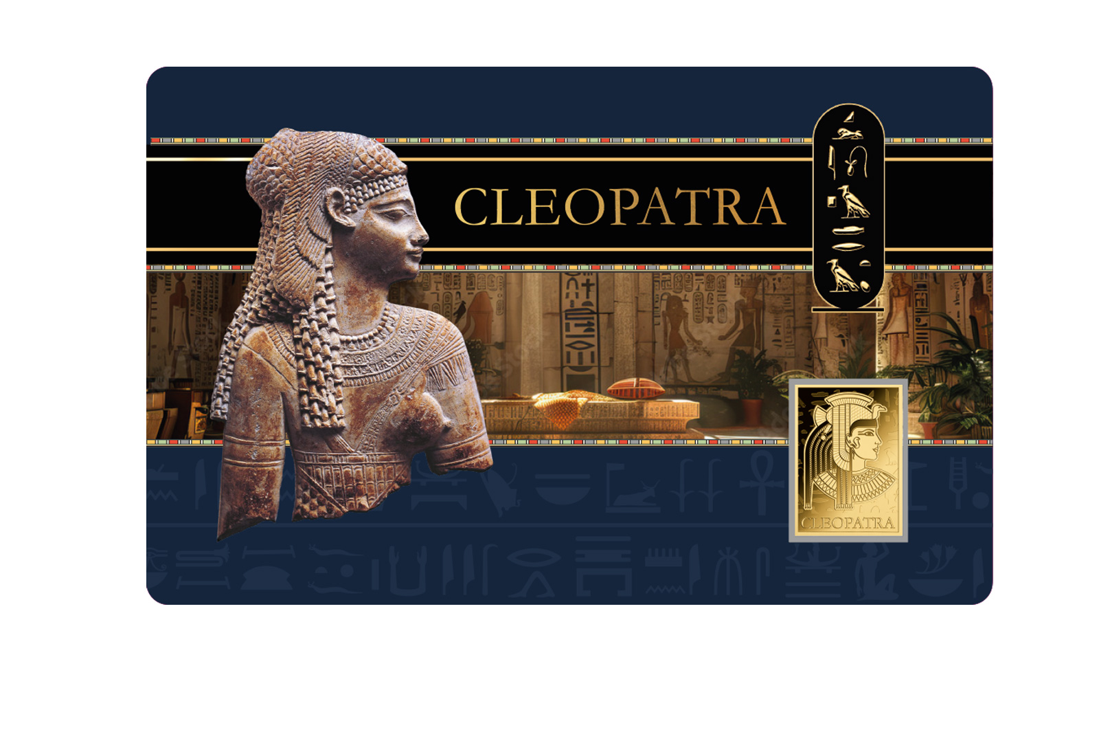Auf der Vorderseite der Goldausgabe ist ein klassisches Porträt Cleopatras dargestellt, das sich an historischen Darstellungen der späten ptolemäischen Zeit orientiert. Die Goldausgabe besteht aus Gold mit einer Feinheit von 999/1000 und ist sicher in die Goldcard integriert.