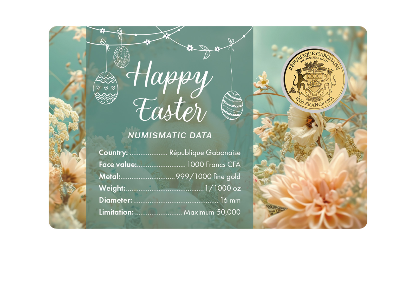 Die Münze zeigt ein fröhliches Küken, das aus einer Eierschale schlüpft - umgeben von feinen floralen Verzierungen sowie der Aufschrift "Happy Easter". Die Coincard selbst ergänzt das Motiv durch eine harmonische Osterlandschaft mit Blüten, Eiern und einem naturgetreu dargestellten Küken. Zusammenspiel von Münze und Coincard ergibt eine ausgesprochen stimmungsvolle Präsentation und ein ideales Geschenk für Sammler sowie Osterliebhaber.