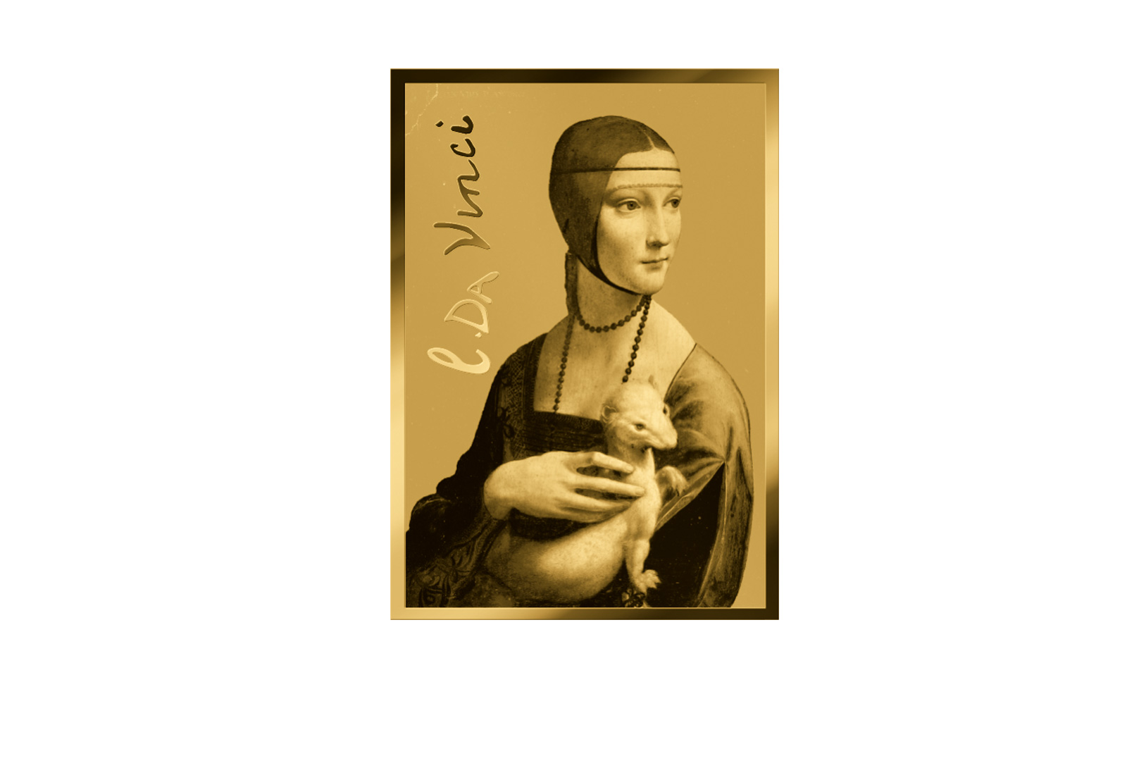 Diese kunstgeschichtlich inspirierte Coincard zeigt das weltberühmte Gemälde "Dame mit dem Hermelin" von Leonardo da Vinci. Das Porträt zählt zu den herausragenden Werken der Hochrenaissance und besticht durch seine harmonische Komposition und stille Ausdruckskraft. In das vertikale Format der Coincard ist eine rechteckige Goldmünze aus 999/1000 Gold integriert.