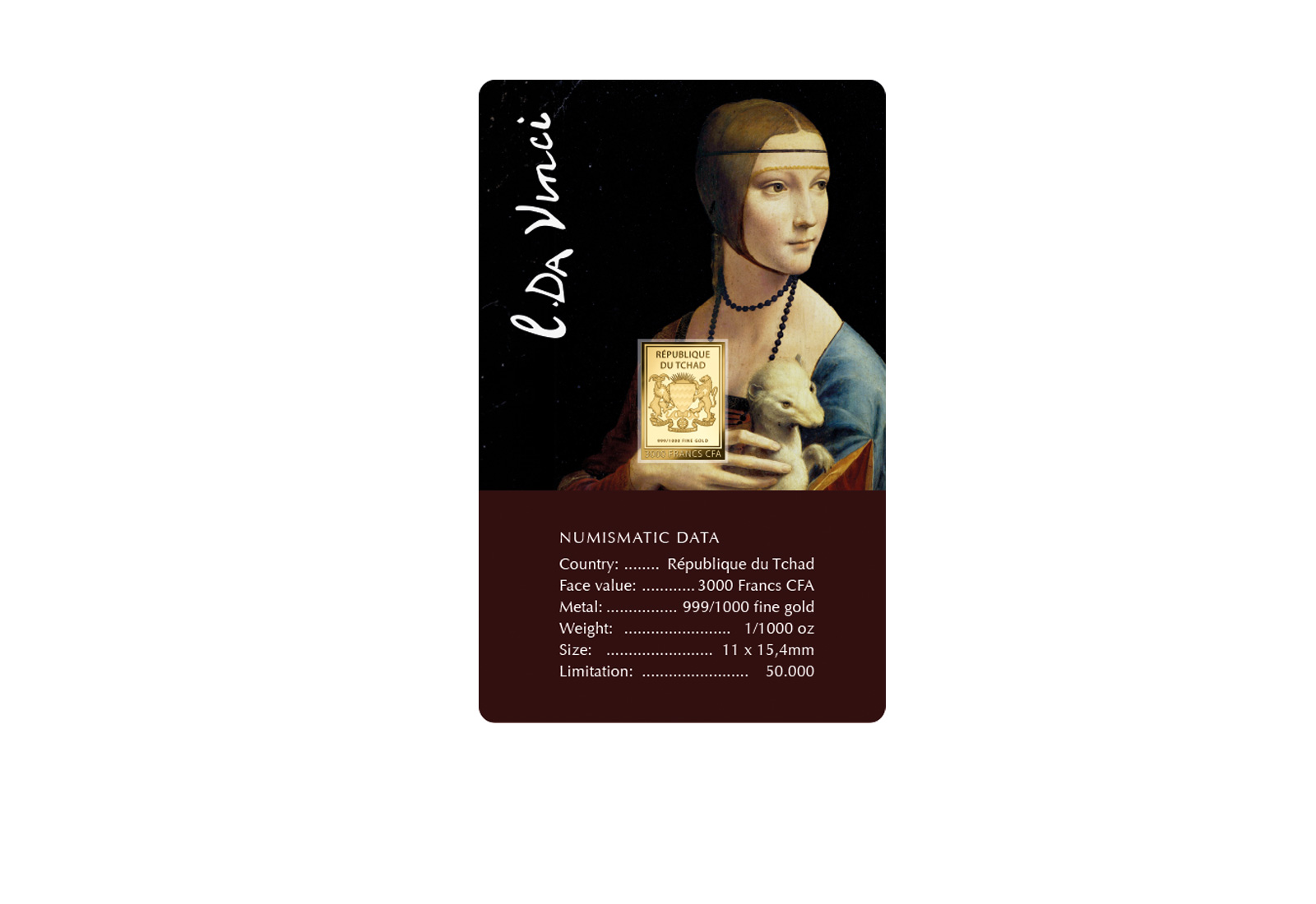 Die Vorderseite der Coincard zeigt die dargestellte Dame mit dem weißen Hermelin auf dem Arm, eingefasst in ein tiefschwarzes, kontrastreiches Hintergrundfeld. Die Goldmünze befindet sich im Brustbereich des Motivs und zeigt eine abstrahierte Miniatur des Originals mit dem Schriftzug "L. Da Vinci".