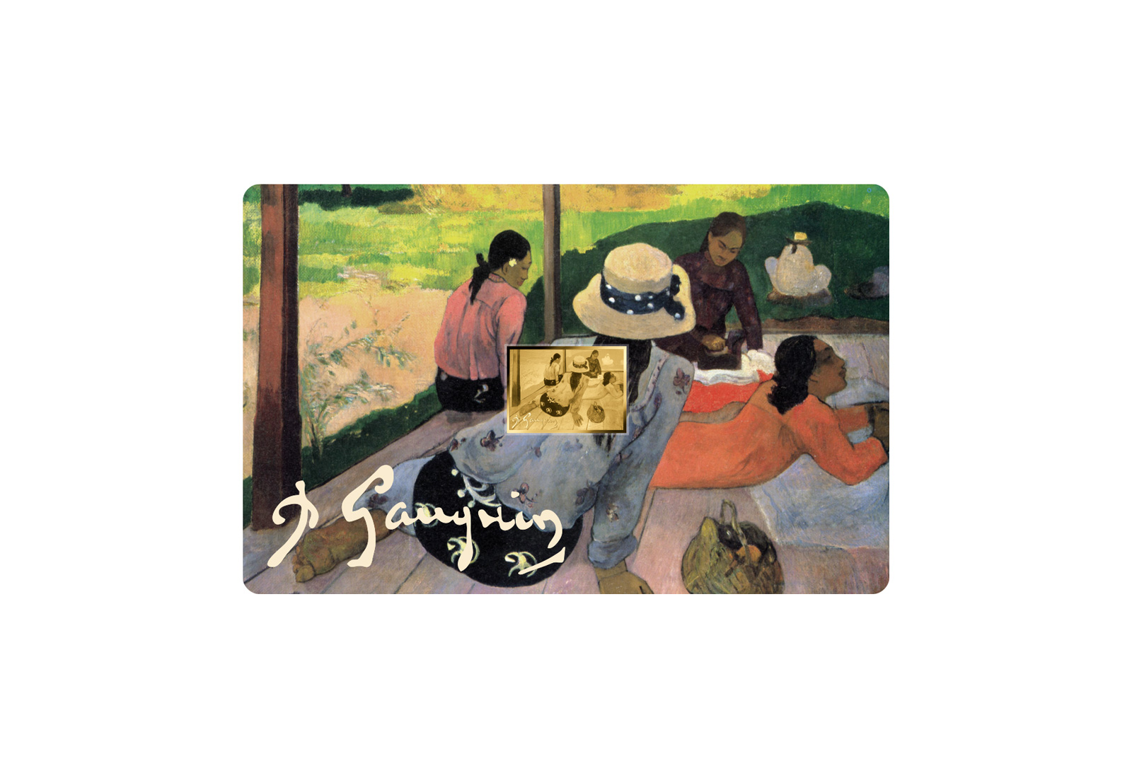 Diese stilvoll gestaltete Coincard zeigt das Motiv "Die Mittagsruhe" von Paul Gauguin und verbindet kunstgeschichtlich inspiriertes Design mit einer integrierten Goldmünze in 999/1000 Gold. Die Vorderseite der Coincard zeigt eine Szene mit mehreren Personen in entspannter Körperhaltung unter freiem Himmel - ein Moment des Innehaltens, eingefangen in charakteristischer Farbgebung und flächiger Komposition.