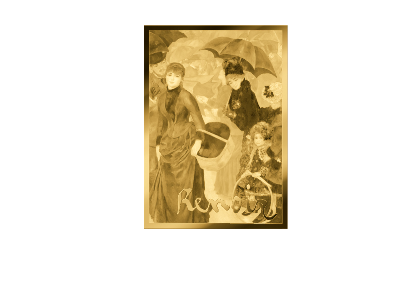 Pierre-Auguste Renoir war ein herausragender Vertreter des Impressionismus. "Die Regenschirme" zählt zu seinen bekannten Werken und besticht durch seine differenzierte Farbgebung sowie die harmonische Verbindung von Figuren und Umgebung. Die Coincard fängt diese Wirkung geschmackvoll ein und macht sie als Geschenk oder Sammelobjekt erlebbar.