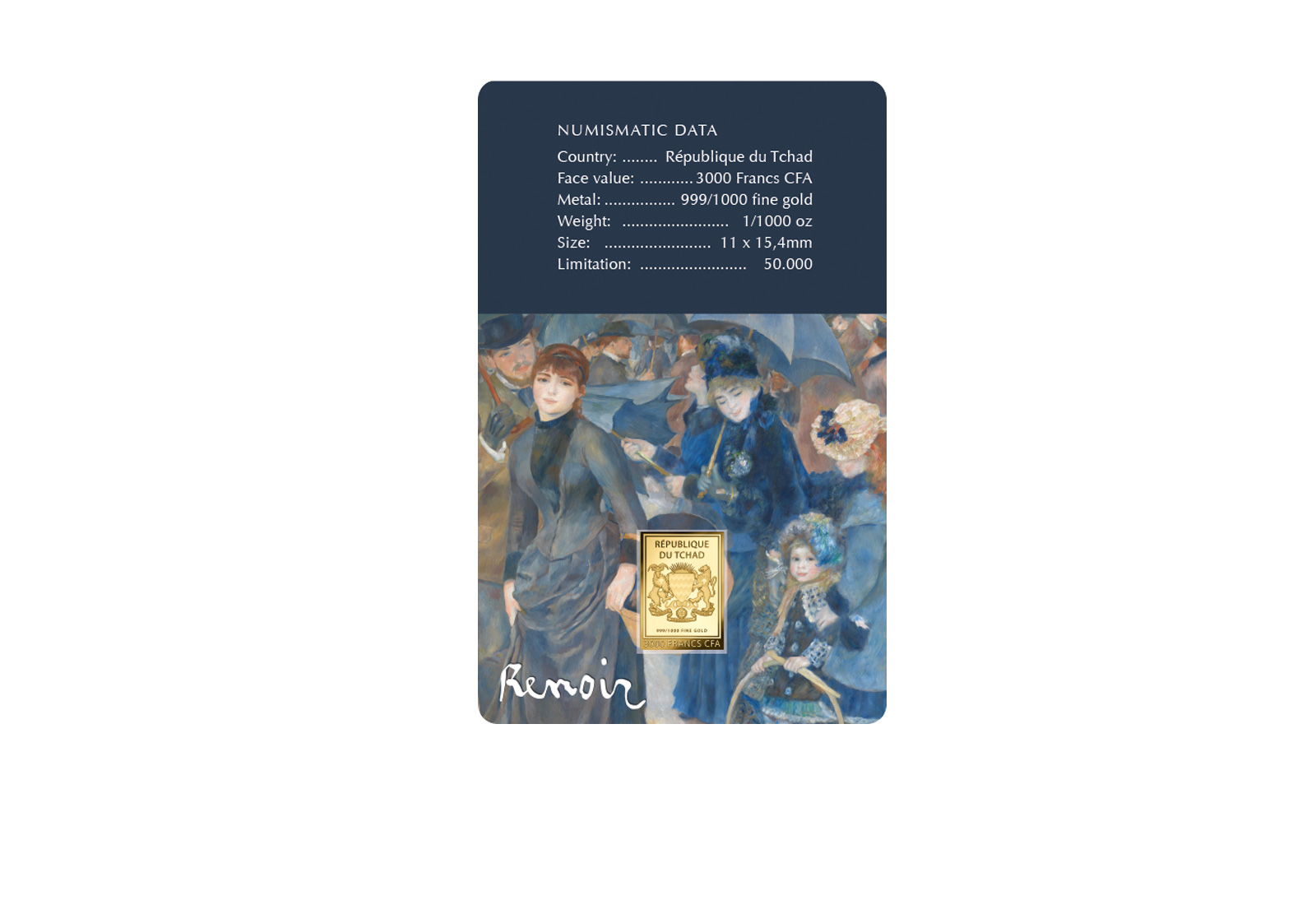 Diese liebevoll gestaltete Coincard mit symbolträchtigem Motiv von Pierre-Auguste Renoir eignet sich hervorragend als originelles Präsent für Kunstfreunde, Sammler und alle, die ein besonderes Geschenk aus echtem Gold suchen.