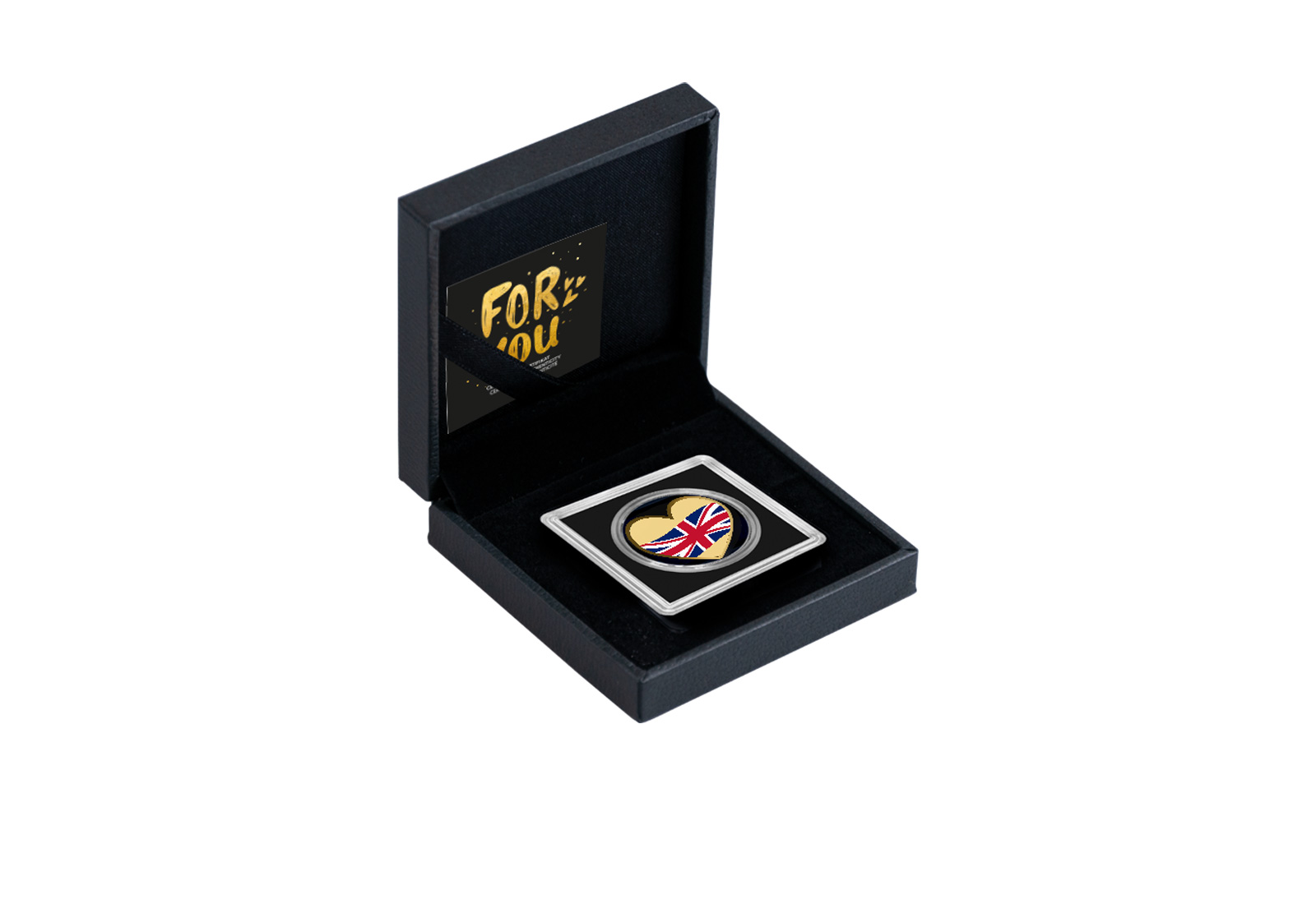 Die Goldmünze präsentiert sich mit einer liebevoll gestalteten Flagge des Vereinigten Königreichs, die elegant und kunstvoll in das Herz integriert wurde. Dieses Symbol vereint Tradition mit modernem Design und wird durch das glänzende 999/1000 Gold eindrucksvoll hervorgehoben.