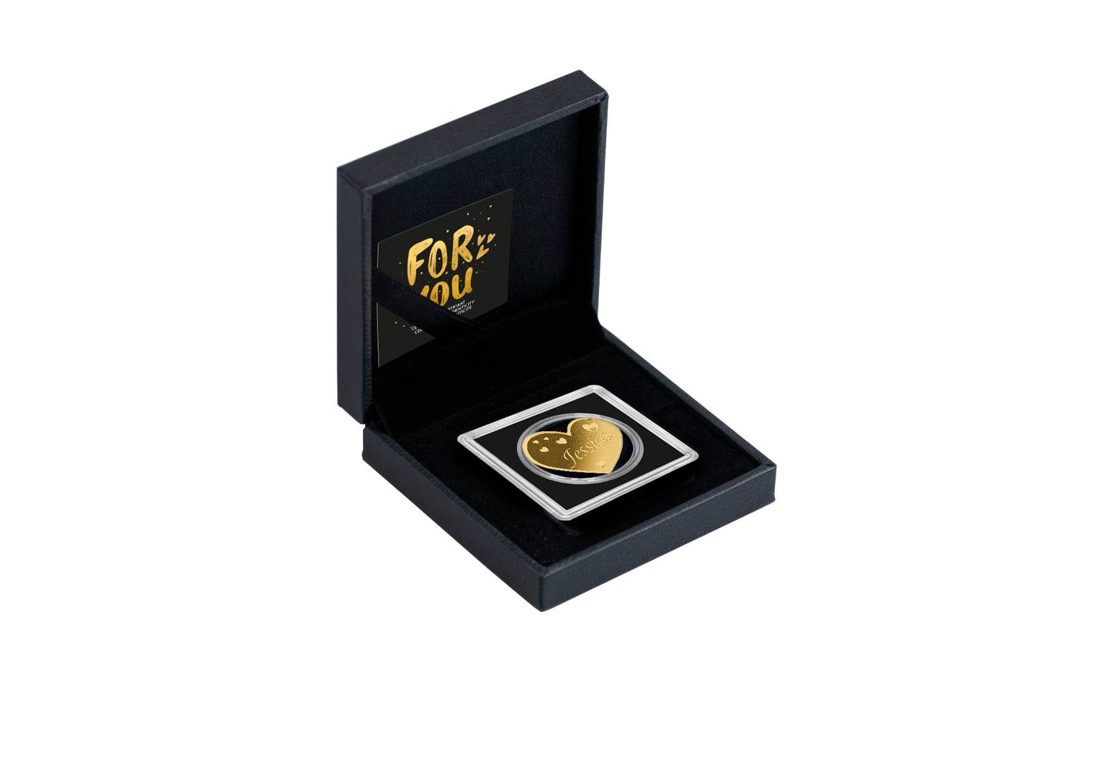 Die Vorderseite der Goldmünze präsentiert sich mit einer kunstvollen Gravur: Das Herz, zentral mit dem Namen "Jessica" eingeprägt, ist umgeben von kleineren, eingravierten Herzen, die symbolisch für Liebe und Fürsorge stehen. Die kunstvolle Verarbeitung auf dem glänzenden Gold schafft eine beeindruckende Ästhetik, die den Betrachter sofort in ihren Bann zieht. Mit einer Feinheit von 999/1000 bietet das Stück nicht nur emotionalen, sondern auch ästhetischen Wert.