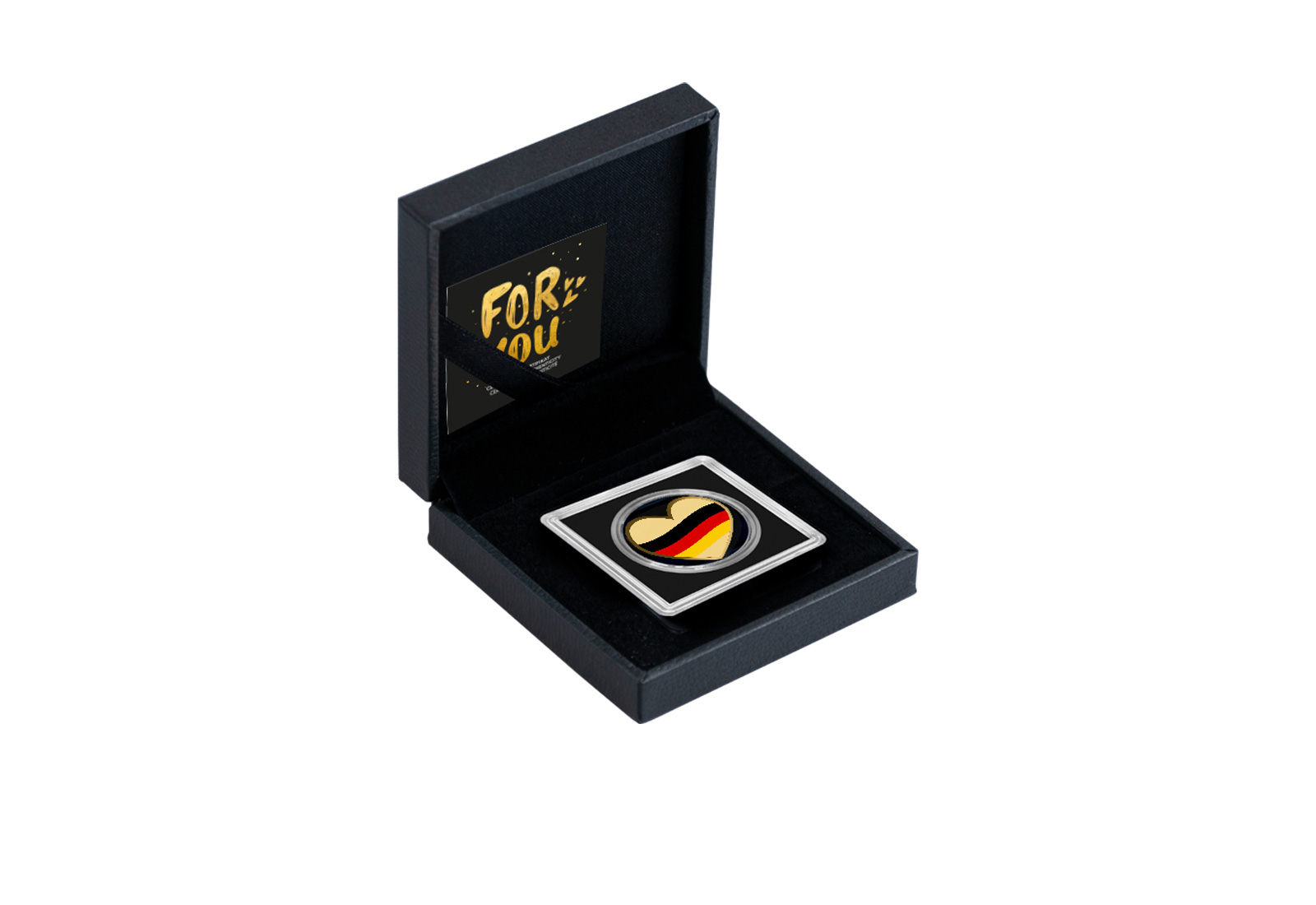 Die formschön gestaltete Goldmünze in dekorativer Herzform trägt die Farben der deutschen Nationalflagge - Schwarz, Rot und Gold - als harmonisches Gestaltungselement auf der Vorderseite. Die ausdrucksstarke Farbgebung in Kombination mit der ansprechenden Herzform macht diese Münze zu einem geschmackvollen Geschenk mit emotionaler Aussagekraft.