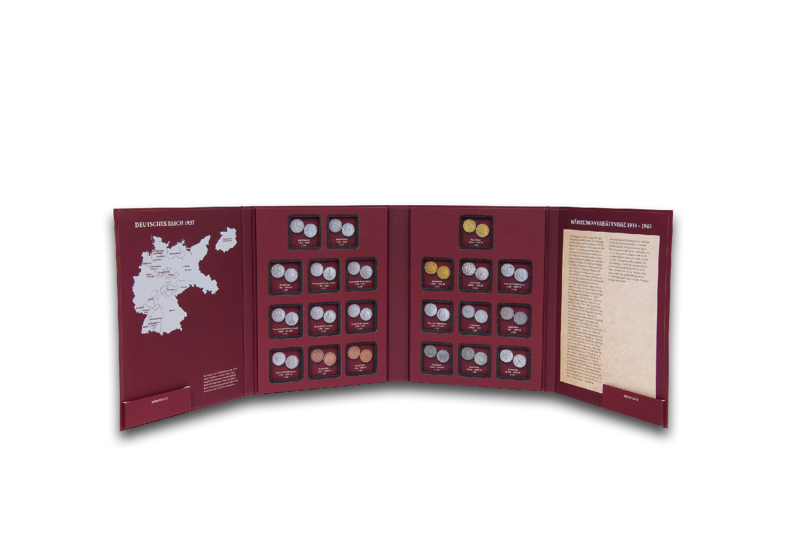 Das Dritte Reich - ein dunkles Kapitel deutscher Geschichte, das numismatisch nur wenige Spuren hinterlassen hat, aber natürlich ein wichtiger Bestandteil jeder gut sortierten Deutschland-Sammlung ist. An den Münzen der Jahre 1933-1945 lässt sich die Dramatik der Geschichte ablesen. Zunächst noch ganz im Geiste der Münzprägung der Weimarer Republik, wurde 1936 der Adler mit Hakenkreuz als Hoheitssymbol eingeführt.