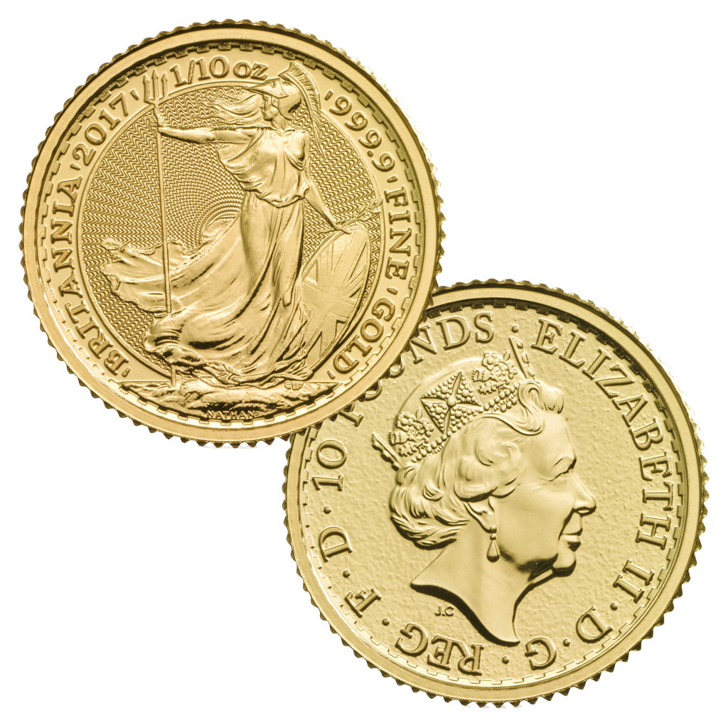 1 Unze, ½ Unze, ¼ Unze und 1/10 Unze. Zunächst übernahmen die Briten die Feinheit von ihren klassischen Goldmünzen, den Sovereign, so dass die Britannia in einer Feinheit von 916,67 (22 Karat) geprägt wurde. Seit dem ersten Jahrgang wurde das Design der Britannia alle zwei Jahre geändert. Diese wechselnden Motive machten die Münze auch für Sammler sehr interessant. Mit dem Prägejahr 2013 wurde die Feinheit geändert, seitdem besteht die Britannia aus 999,9er Gold.