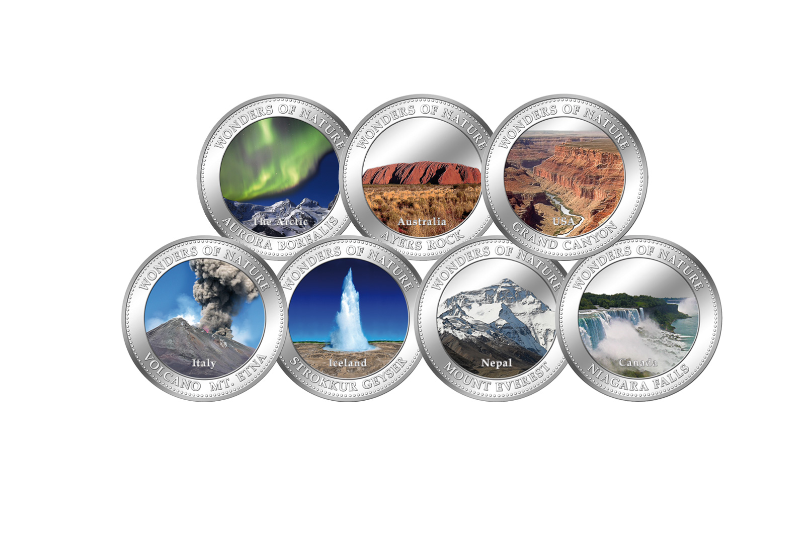 Die 7er Kollektion "7 Wunder der Natur" ist eine beeindruckende Hommage an die atemberaubenden Naturwunder unserer Welt. Diese einzigartige Sammlung vereint sieben sorgfältig ausgewählte Münzen, die jeweils ein bedeutendes Naturwunder darstellen. Jede Münze ist mit einer detailreichen Farbapplikation versehen, das die Schönheit und Einzigartigkeit dieser Naturwunder eindrucksvoll zur Geltung bringt.